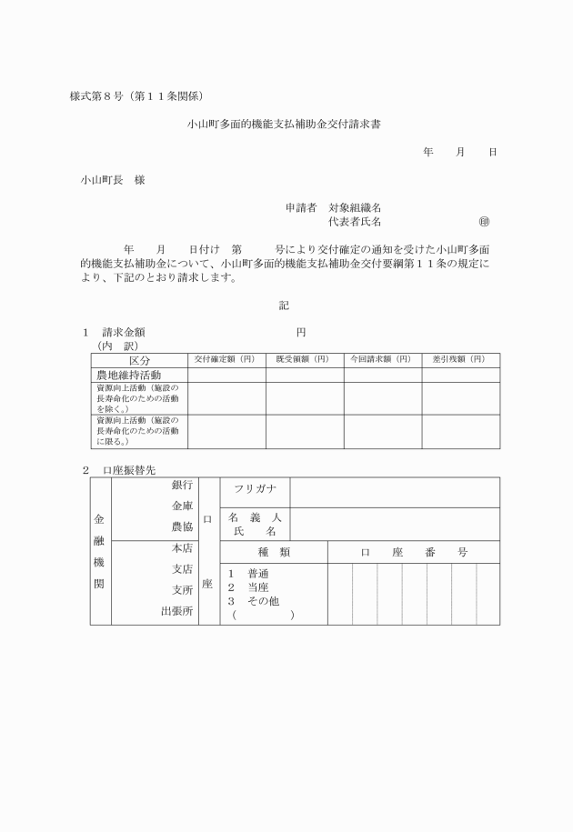 第11条 補助金確定の通知を受けた補助決定者は、確定の通知を受けた日から起算して7日以内に小山町多面的機能支払補助金交付請求書(様式第8号)を町長に提出しなければならない。