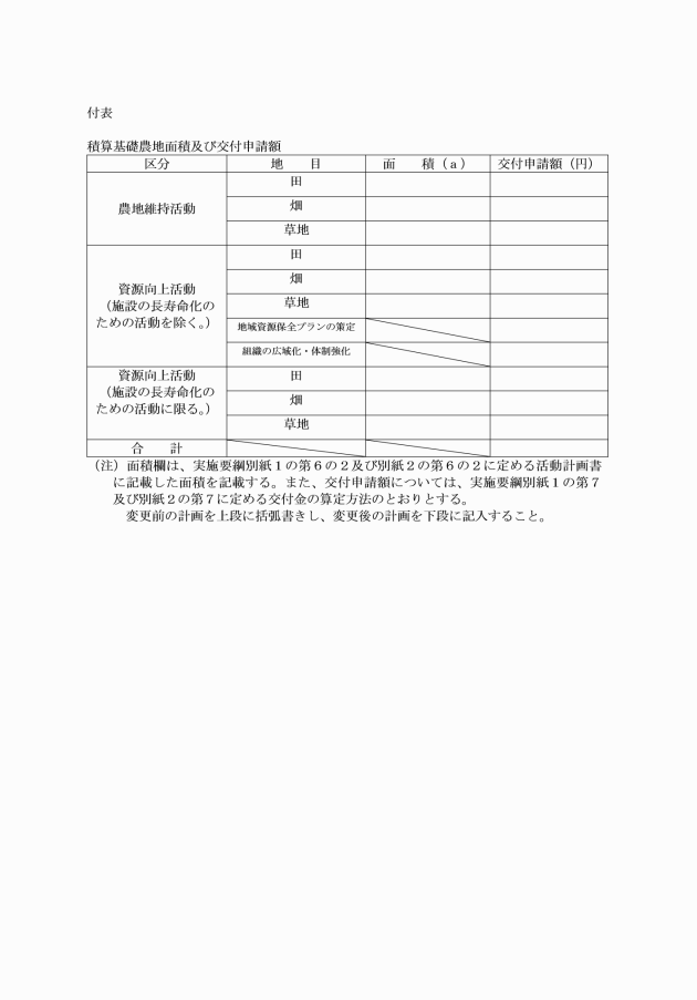 農地維持活動及び資源向上活動(施設の長寿命化のための活動を除く。) | 実施要綱別紙1の第4又は別紙2の第4に定める対象活動(施設の長寿命化のための活動を除く。)に要する経費 | 事業計画の対象面積に実施要綱別紙1の第7の2及び別紙2の第7の2(1)の交付単価をそれぞれ乗じて得た額 |