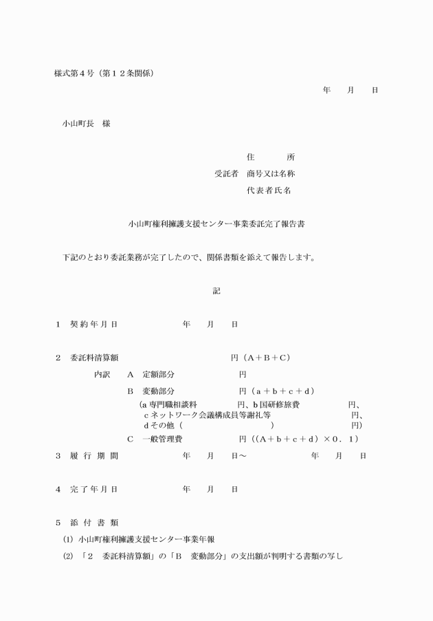 第8条 事業実施要綱第2条第2項の規定によりセンター事業を委託した場合において、センター事業の受託者(以下「センター事業受託者」という。)は、町長に小山町権利擁護支援センター事業計画書(様式第1号)を提出しなければならない。